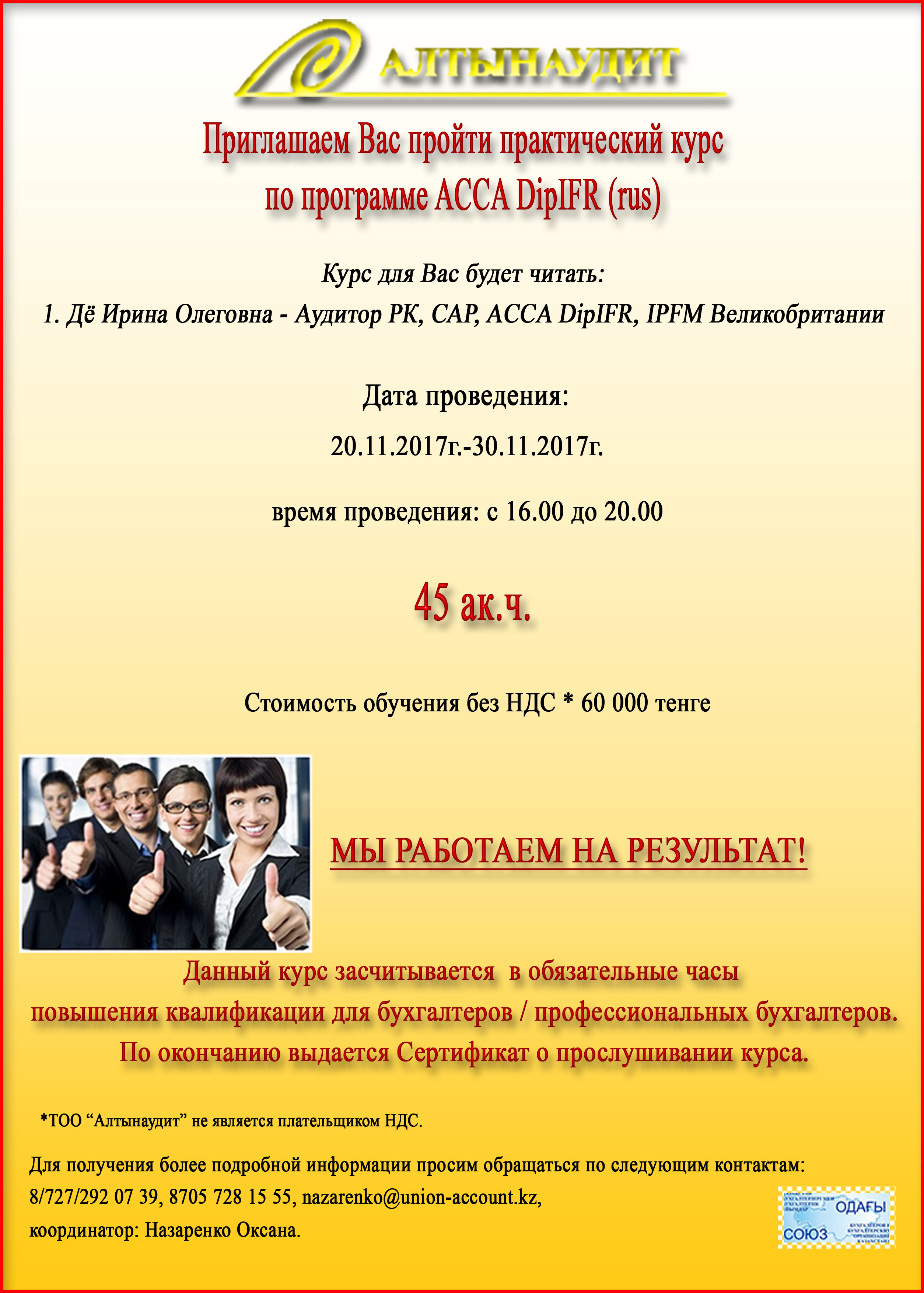 | ТОО "Алтынаудит" | Практический курс по программе ACCA DipIFR(rus) | Пользователи 60.000 Члены союза 60.000 |