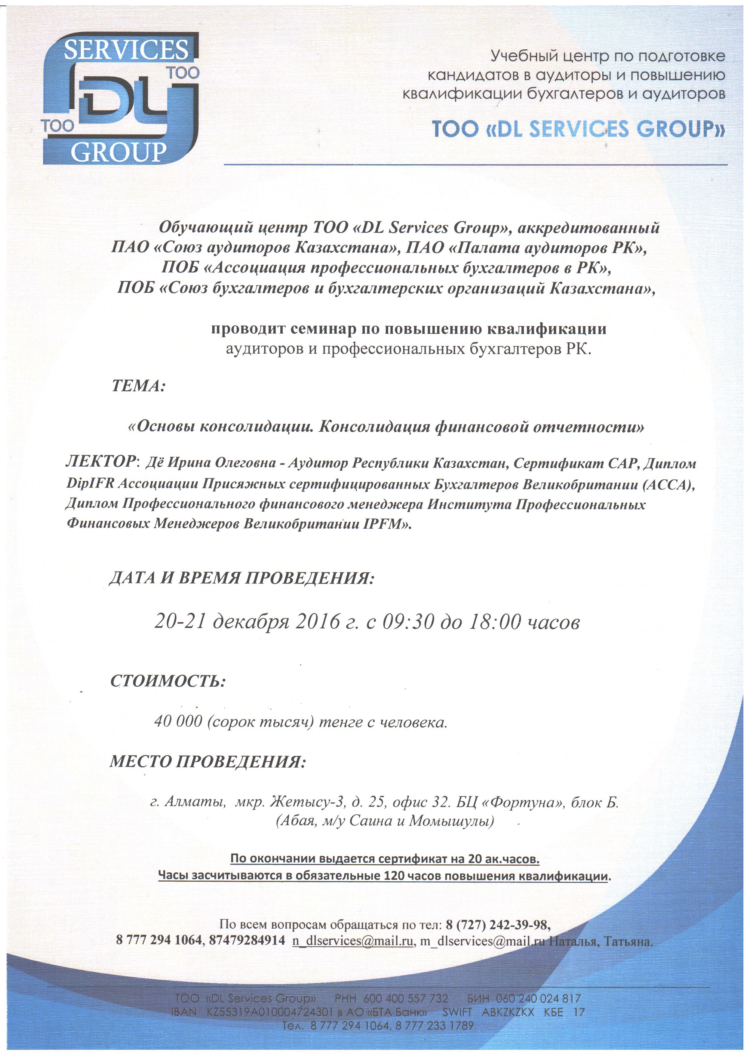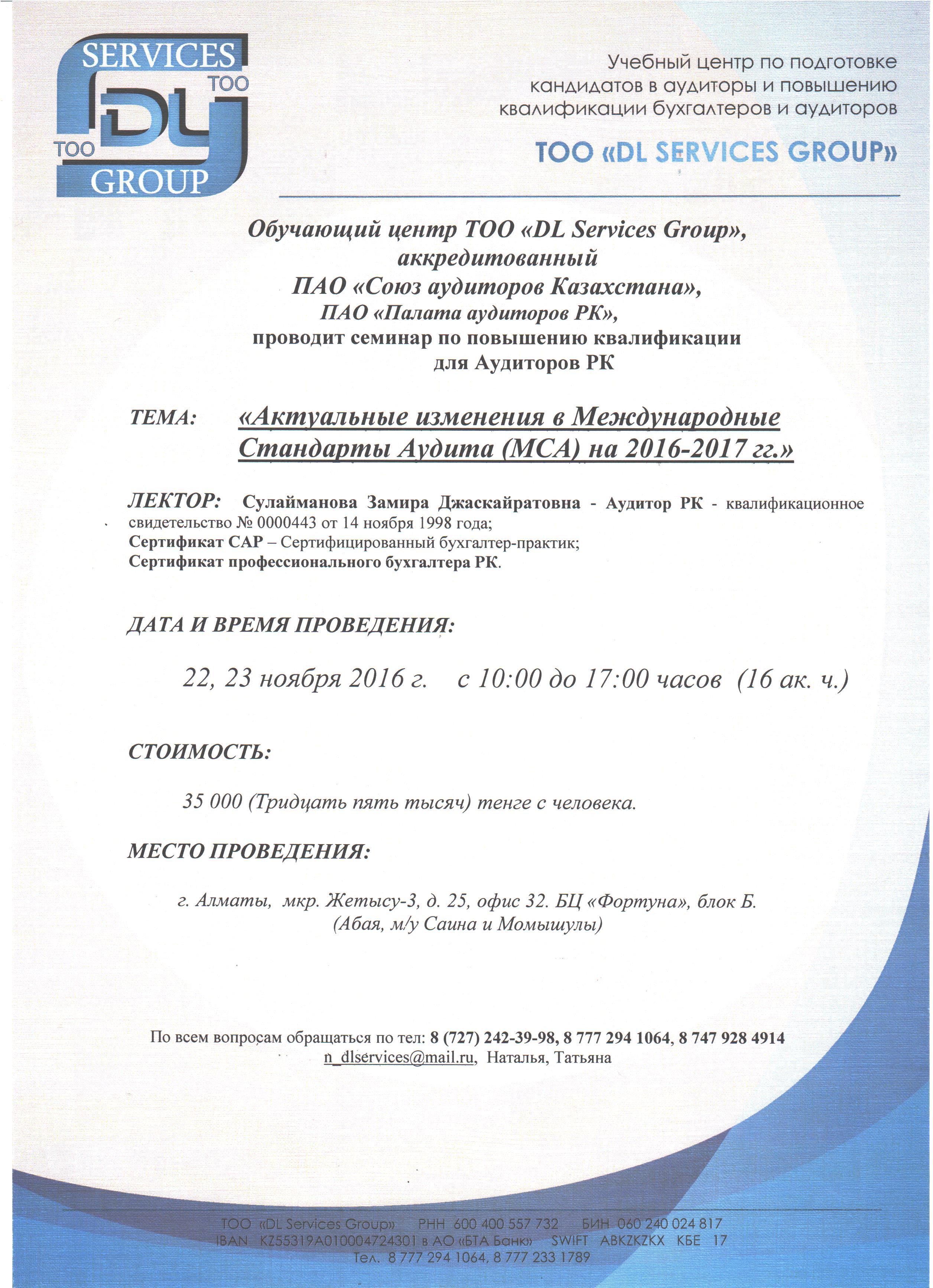| ТОО "DL Services Group" | "Актуальные изменения в Международные Стандарты Аудита (МСА) на 2016-2017гг." | Пользователи 35 000 Члены союза 35 000 |