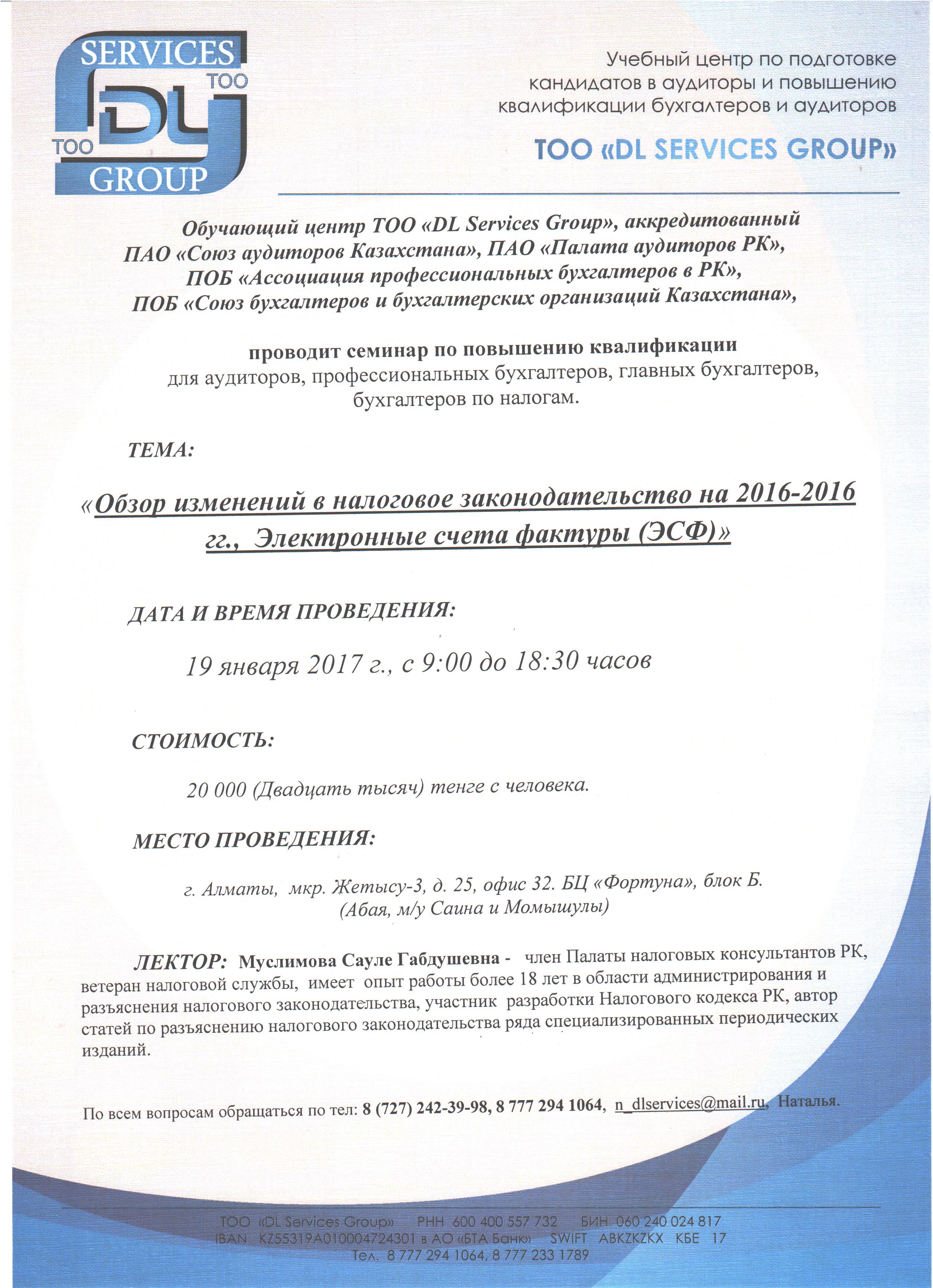 | ТОО "DL Services Group" | "Обзор изменений вналоговое законодательство на 2016 - 2017г.г., Электронные счета фактуры (ЭСФ)" | Пользователи 20 000 Члены союза 20 000 |